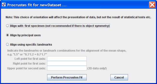 This dialog box requests information on how the configurations are to be aligned. To be more precise, what is chosen here how the Procrustes mean is to be aligned relative to the coordinate axes -- the individual observations will follow this orientation more or less, depending on the shape variation in the dataset. This choice of the coordinate system is primarily of interest for the graphical output of the subsequent analyses. Note that the choice of the alignment does not affect the statistical outcomes of subsequent analyses, but may change the appearance of graphical output.