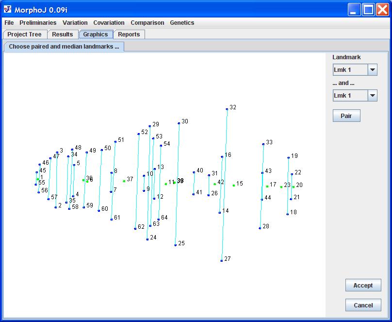 For many datasets this initial guess of the pairing of landmarks is correct and the user can choose to go on to the actual Procrustes fit by clicking the Accept button.