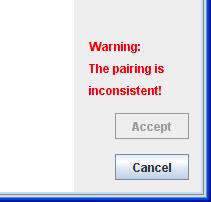 In order to carry out the Procrustes fit, the user first must rectify the problem with the landmark pairing. The two drop-down menus in the upper-right corner of the interface can be used to select landmark pairs, and clicking the Pair button will establish the two selected landmarks as a pair. To specify a landmark as unpaired, select it in both drop-down menus and click the Pair button. Once every inconsistency in the pairing is eliminated (if landmark a is declared as paired with landmark b, landmark b must be declared as paired with landmark a), the Warning message disappears and the Accept button is activated and can be used. Nevertheless, the user should still check whether the pairing is indeed correct.