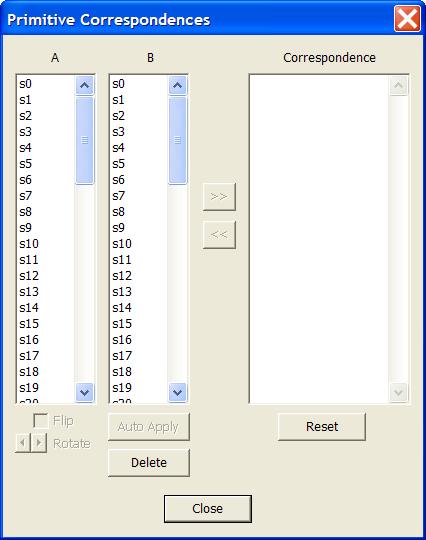 The two lists A and B contain the landmarks in the two windows (note that counting starts with 0, not 1). Select s0 (the first landmark) in the lists for both windows, and then click on the button marked >>. This will move the two landmarks into the list of correspondences, on the right side of the dialog box. Click the >> button for every landmark, until no more are left in lists A and B.
