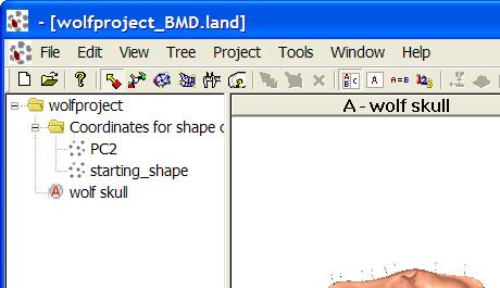 Two icons are attached to this folder icon: one is named according to the shape change you saved in MorphoJ ("PC2" in the screen shot below, as the information was exported from a graph showing the shape change for a principal component) and the other is names "starting_shape". This starting shape is usually the mean shape in the MorphoJ dataset (e.g. for graphs of principal components, canonical variates or regression), but it can be something else (e.g. in shape changes mapped onto phylogenies, where the user can select the starting and target shape separately).
