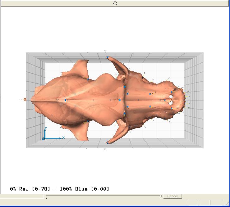 Click the OK button. A surface will appear in window C. Then move the slider all the way to the right, to the 100% position. At this position, the surface shows the shape specified by the information imported from MorphoJ, which may look like this: